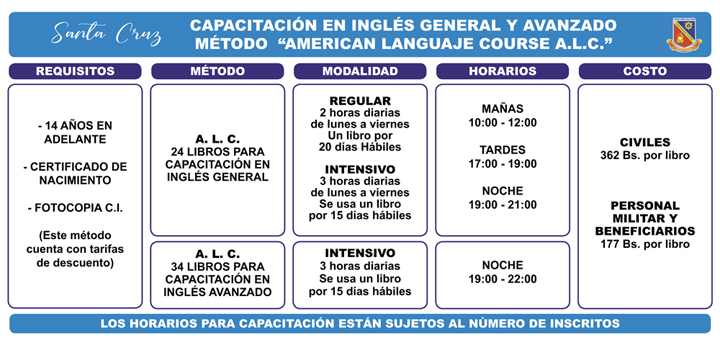 EL aprendizaje del idioma Inglés como lengua extranjera, está diseñado a través de un sistema curricular intensivo, explicativo en el régimen interno del instituto en los siguientes aspectos: organización del aprendizaje en un periodo de 10 meses curso intensivo (militares) y 19 meses el curso avanzado y 24 meses curso regular, facilitando la compresión de la expresión oral a través de la pronunciación de docentes altamente capacitados, con cursos realizados en los Estados Unidos.